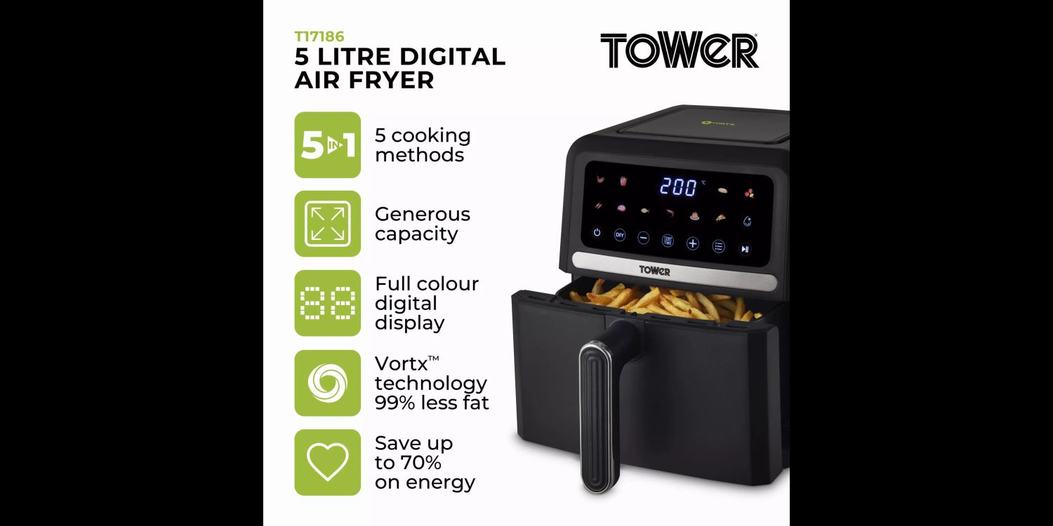 Tower 5 Litre Vortx Air Fryer with Digital Colour Display T17186 additional 1Tower 5 Litre Vortx Air Fryer with Digital Colour Display T17186 additional 2Tower 5 Litre Vortx Air Fryer with Digital Colour Display T17186 additional 3Tower 5 Litre Vortx Air Fryer with Digital Colour Display T17186 additional 4Tower 5 Litre Vortx Air Fryer with Digital Colour Display T17186 additional 5Tower 5 Litre Vortx Air Fryer with Digital Colour Display T17186 additional 6