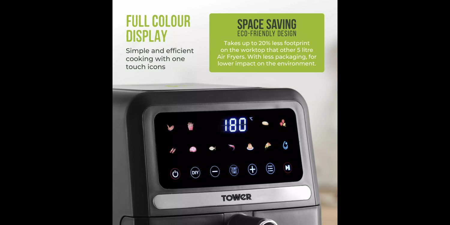 Enjoy seamless and fuss free cooking with this 5L Vortx Air Fryer with Digital Colour Display from Tower.