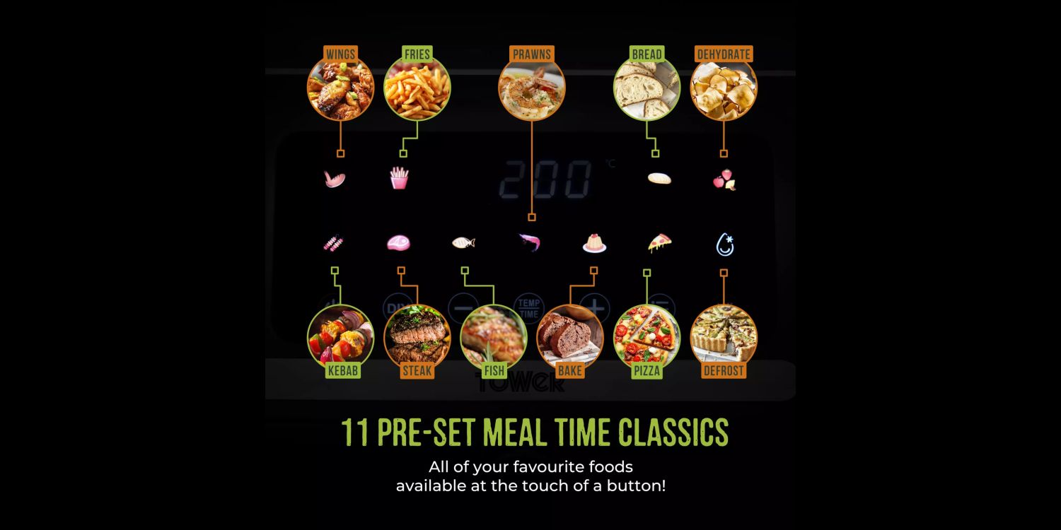 • PRE-SET MEALTIME CLASSICS All of your favourite food available at the touch of a button. Choose from 11 one-touch pre-sets to take the guesswork out of cooking including Fries, Chicken Wings, Baguette, Dehydrate, Kebab, Steak, Fish, Prawns, Bake, Pizza or Defrost