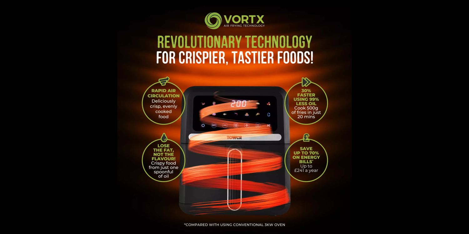 • VORTX TECHNOLOGY Exclusive to Tower Air Fryers, Vortx technology rapidly circulates hot air around food, cooking up to 30% faster than a conventional oven. Vortx also cooks food with a delicious crispy texture and because little to no oil is required, it’s much healthier too!. Lose the fat not the flavour with Vortx Air Frying Technology