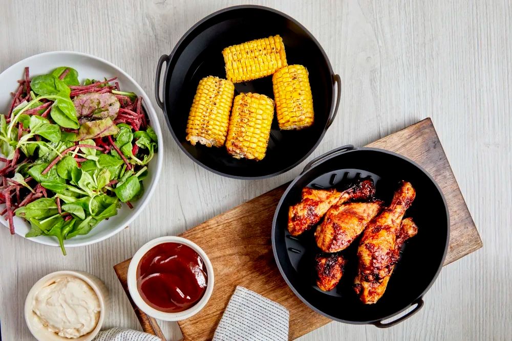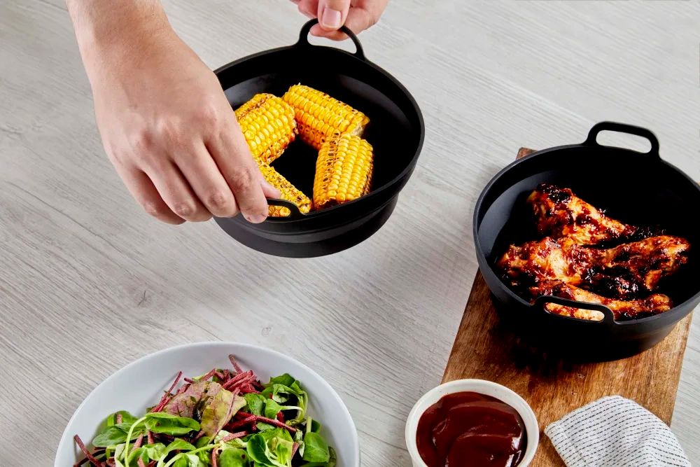 The ribbed interior on the base of the trays collect fat and oil to provide better air circulation and allow food to be heated evenly. Safely lift the trays from basket to plate using the side handles, whilst the sturdy silicone trays stay in shape, ensuring none of the contents spill over whilst handling.