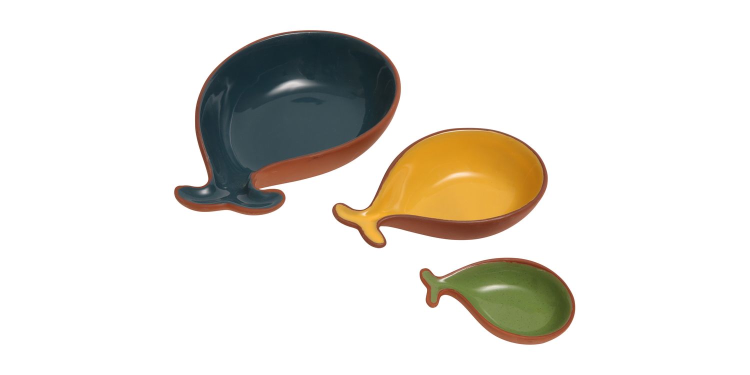 These three beautiful glazed terracotta tapas dishes are a few of the many products in our Sintra collection, inspired by the richness of the architecture and surrounding landscape of Sintra, in Portugal. A set of fun fish shaped dishes perfect for serving tapas and nibbles. Adoringly shaped in 3 different sizes:
