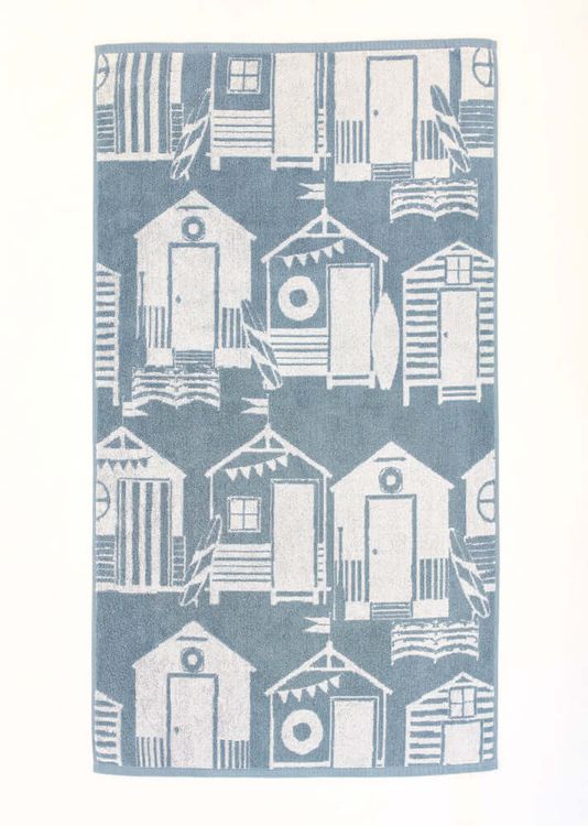Featuring a beautifully woven coastal design of classic beach huts, this towel set is available in two timeless colors – Chambray Blue and Olive Green.