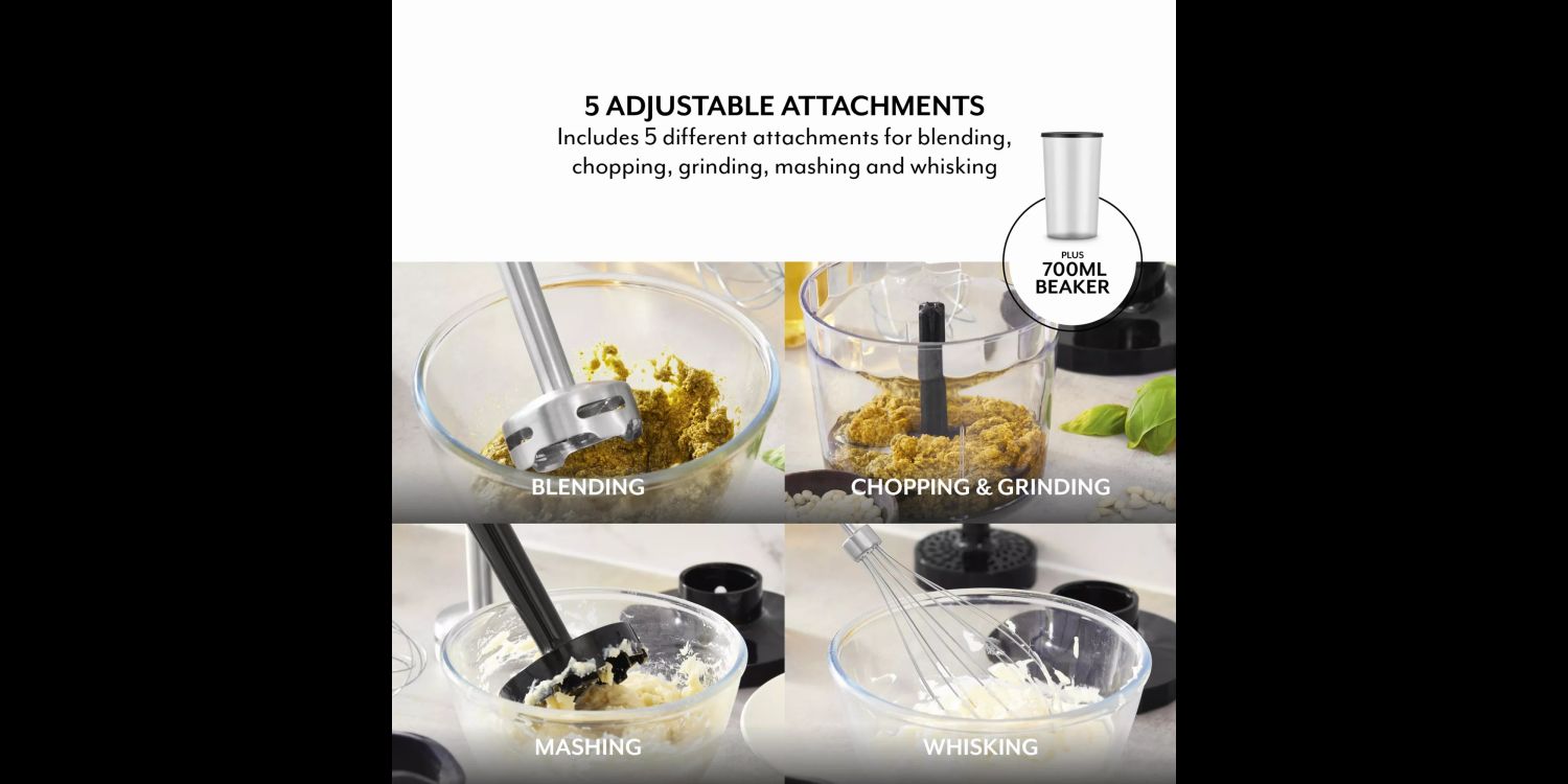 The digital blender comes with five interchangeable attachments for blending, chopping, grinding, mashing potatoes, and whisking.