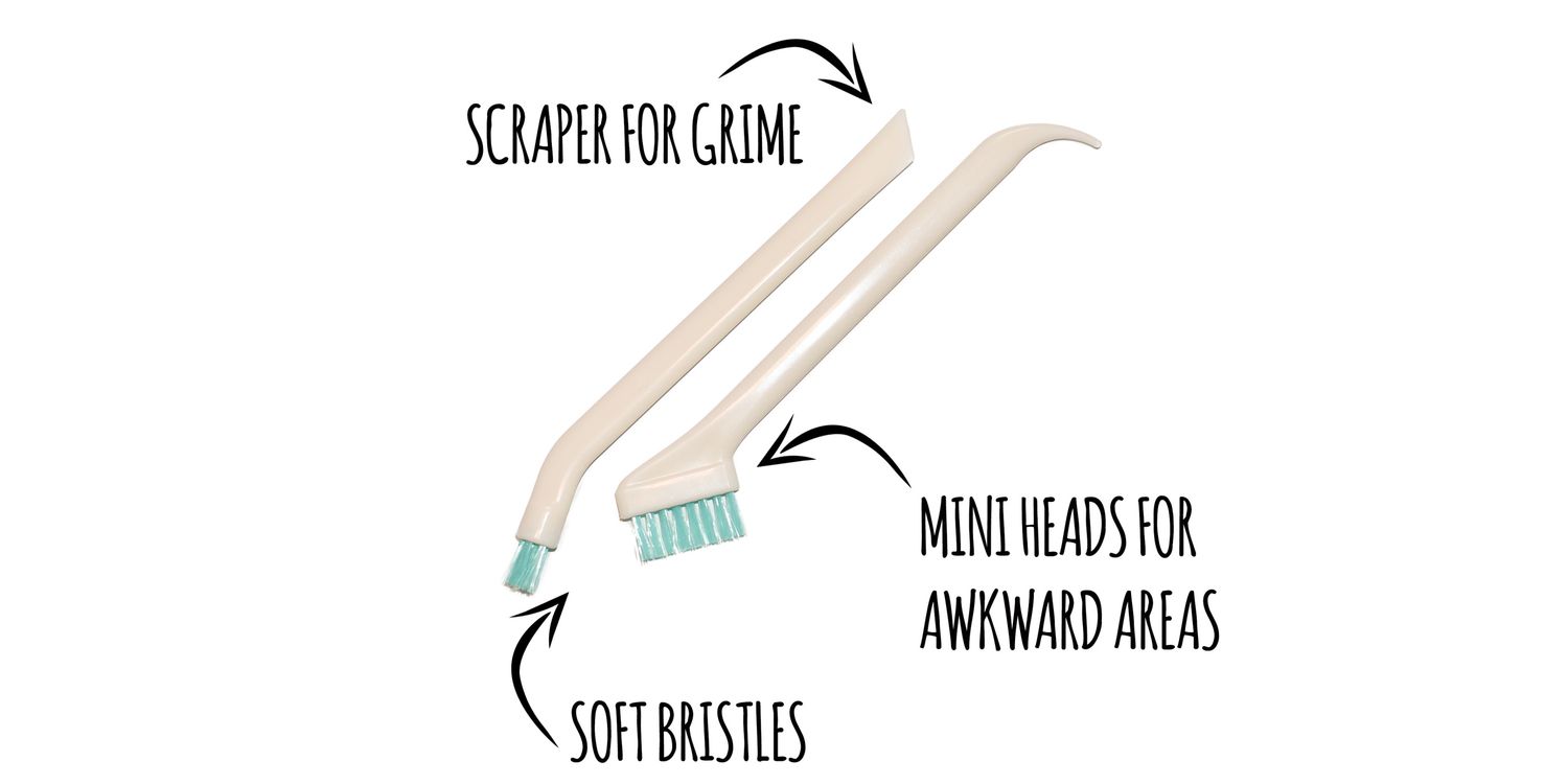 High performance environmentally friendly Between the Gap Brushes are perfect for gaps, corners and hard to reach spots. There are 2 mini brushes with soft bristles for scratch free cleaning and scraper ends for stuck-in grime. Now made with 100% recycled plastic!