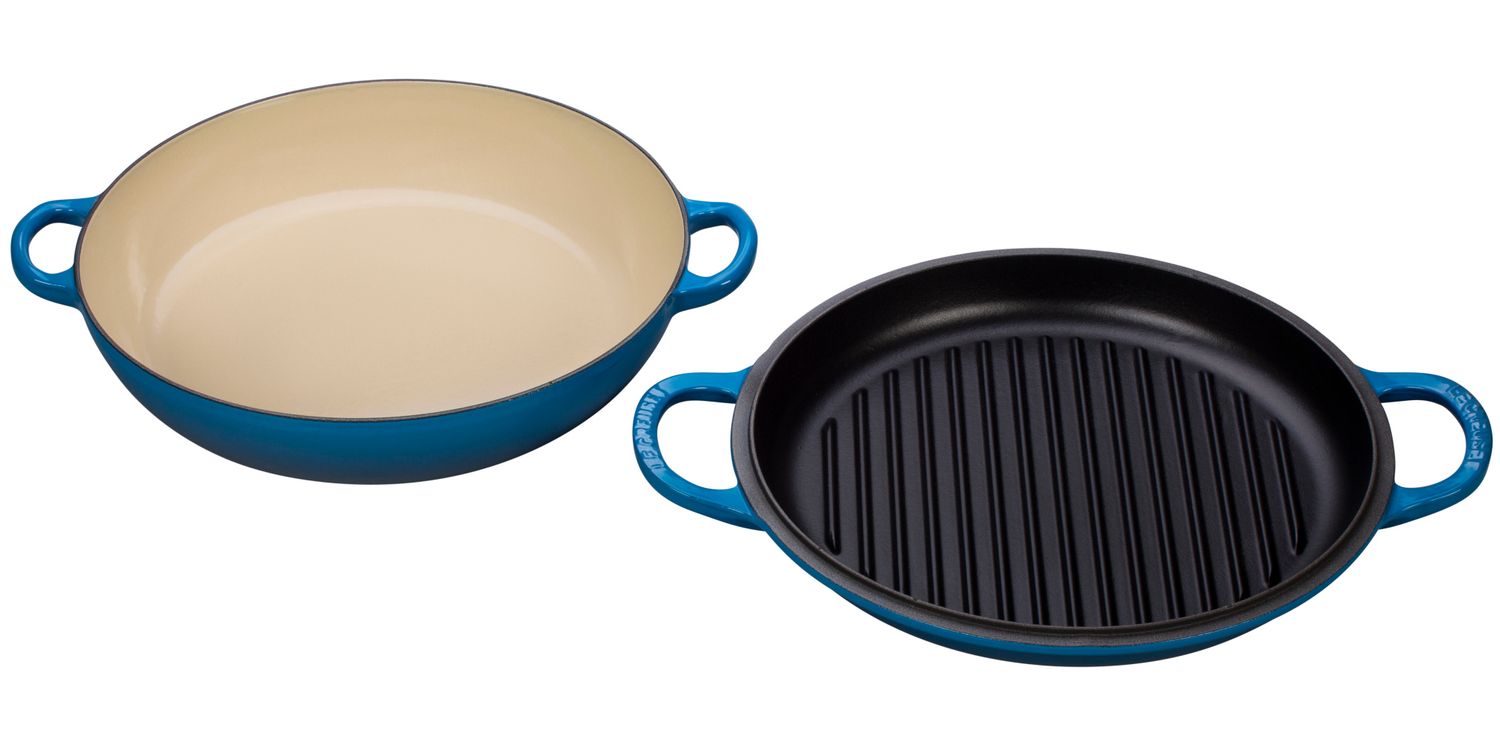 Le Creuset Marseille Blue Shallow Casserole 30cm with Reversible Grill Lid with Free Silicone Handle Grips