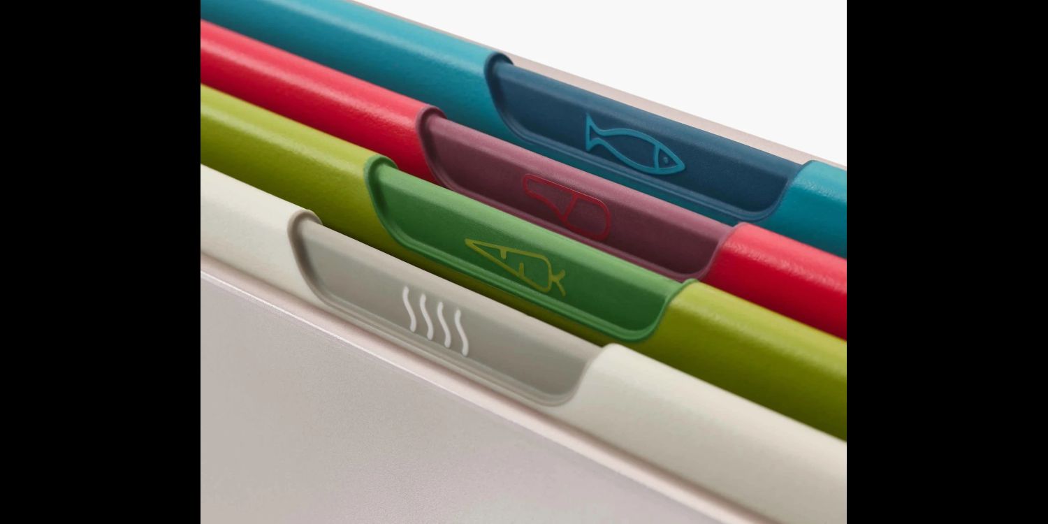• Colour-coded boards with icons indicating which food type they should be used for - raw meat, raw fish, vegetables or cooked food