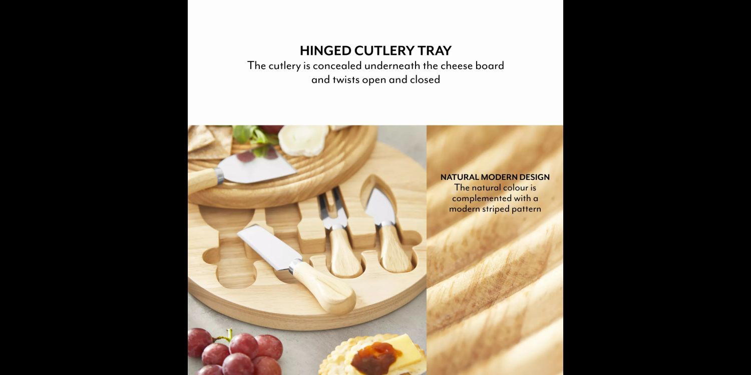 Using quality resourced wood, the natural colour scheme of our cheeseboard is taken one step further and complimented with a modern striped pattern to give a stylish textured finish. It’s neutral and looks great amongst any kitchen décor.