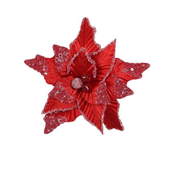20cm red sequin frosted leaves and red leaves poinsettia pick with red and red frosted berries and frosted edging