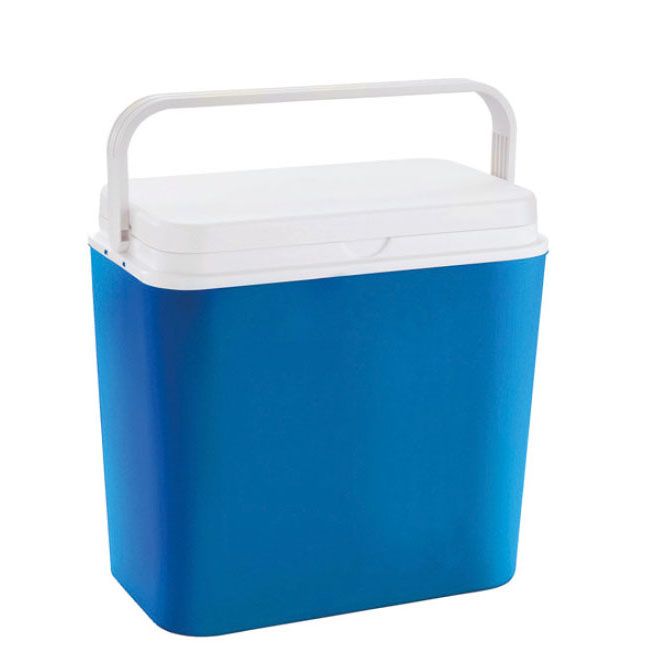 Portable cool box with grooved handle for easier grip. The handle also creates an airtight locking seal when closed