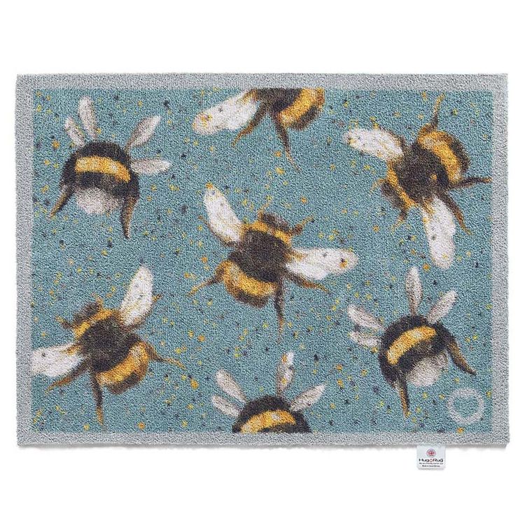 The Bee 3 mat has been created by designers using inspiration from the home and garden. This design has a light blue background with yellow and charcoal splatter/dots with light grey border and multi-directional bumblebees.