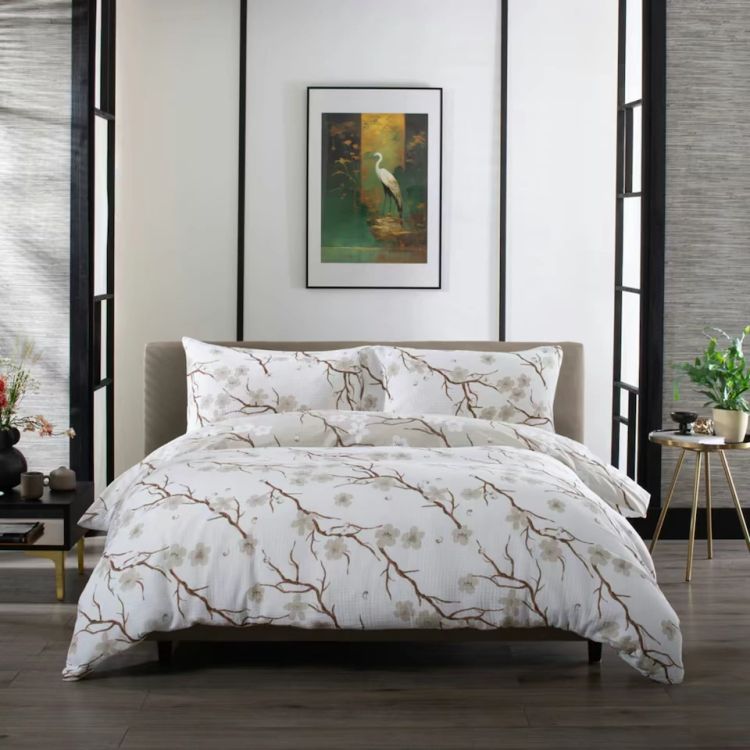 This design brings a serene, nature-inspired elegance to your bedroom with its delicate cherry blossom branch design in soft, neutral tones. Made from 100% cotton with printed double gauze fabric, it offers a luxuriously soft, breathable, and lightweight feel, perfect for year-round comfort. The airy texture and refined print create a tranquil, sophisticated aesthetic, seamlessly blending with both modern and classic interiors.