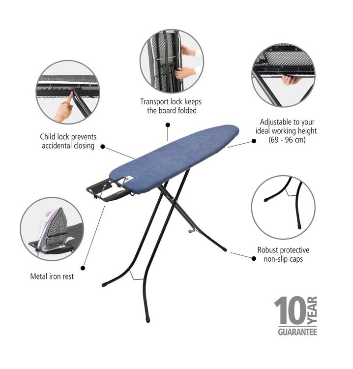 Not too big on ironing? This lean Brabantia Ironing Board A will make even this chore more pleasant. The high-quality ironing board is adjustable in height with a simple trigger switch. Its steam iron rest can be set to left and right handed use.