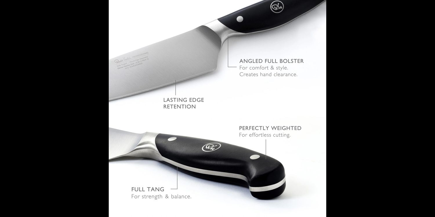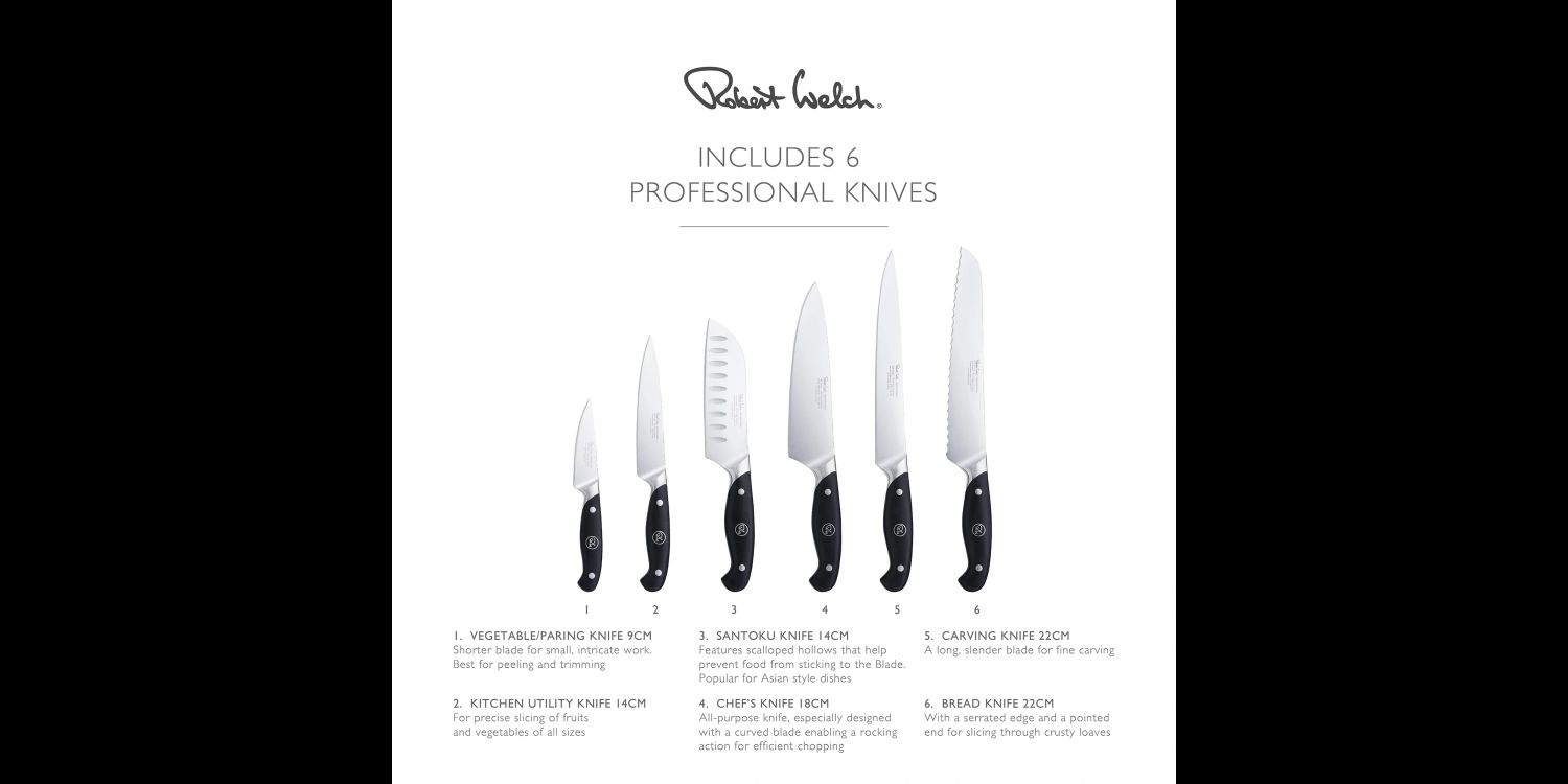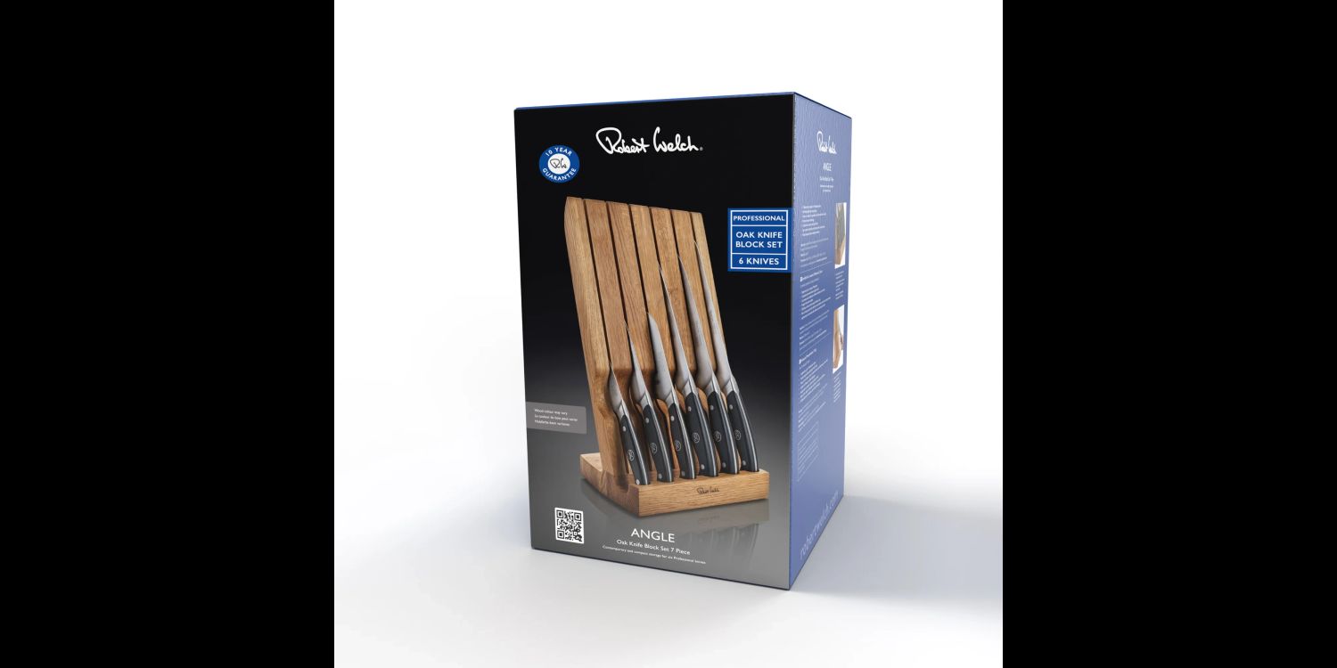 The solid oak block features a vertically angled and space saving design, organising your kitchen workspace whilst protecting knife blade edges. This set comprises an Angle Oak knife block and 6 Professional kitchen knives. Designed to house six Robert Welch kitchen knives.