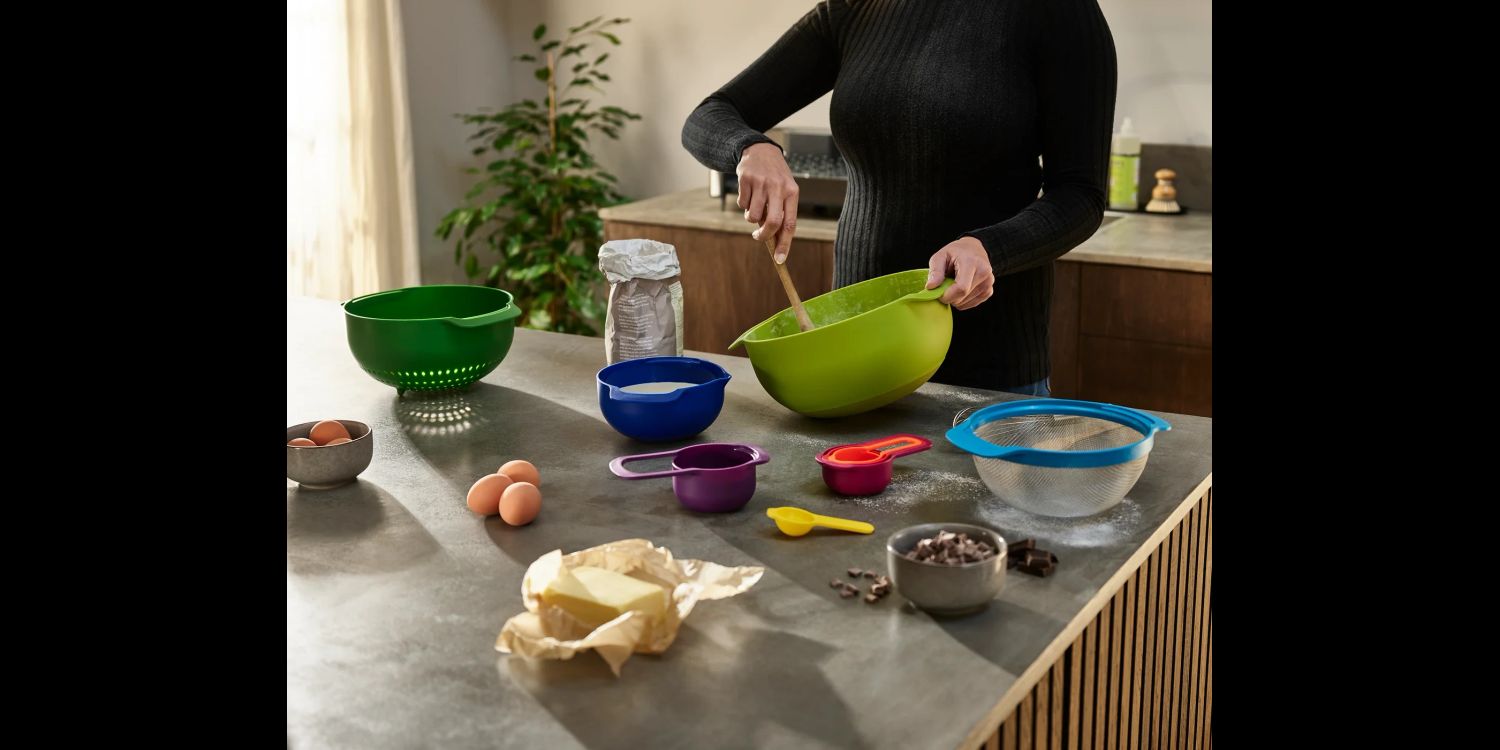 Both mixing bowls now have non-slip bases and wider carry handles and the measuring cups have been redesigned to ‘snap’ together more securely.