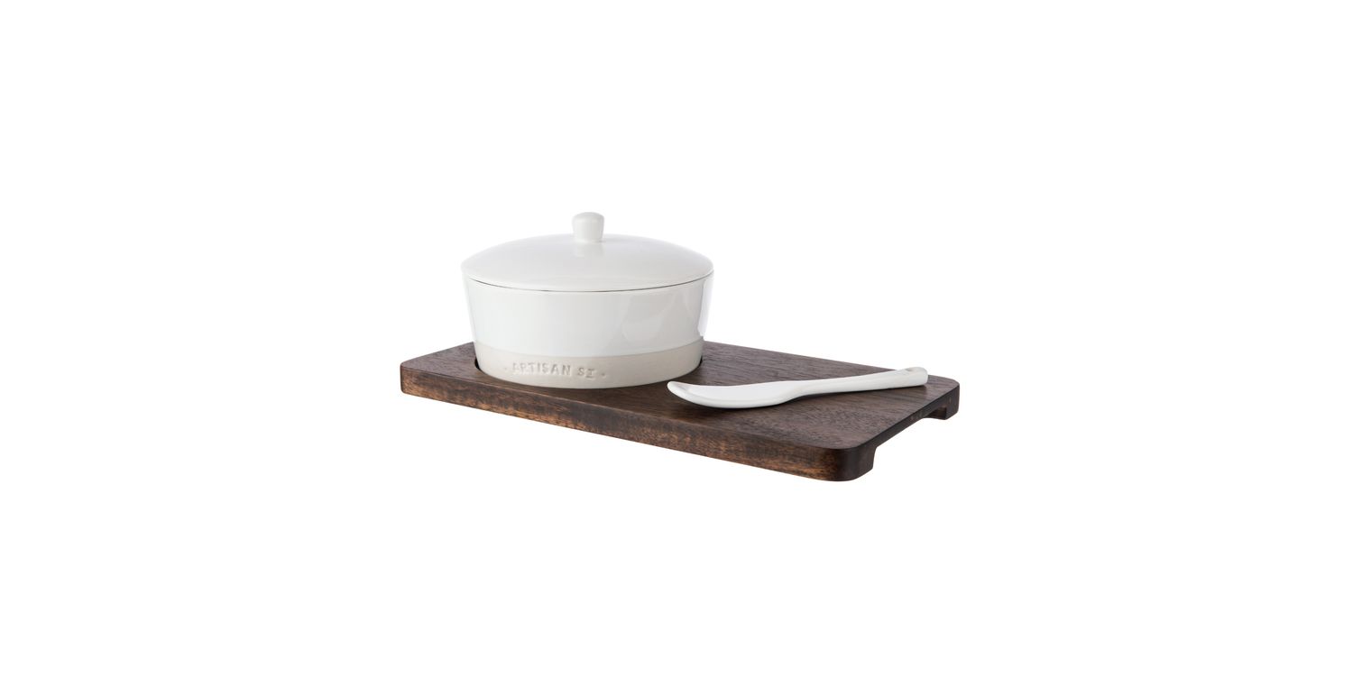 A show-stopping way to bake and serve your favourite cheeses, it doesnt have to be just camembert, its up to you! The lidded pot holds the contents securely whilst the cheese is baked, ensuring it doesn't cause a mess as it melts. The cheese serving utensil adds an additional touch of charm whilst the dark acacia wood board provides a final flourish to the presentation.