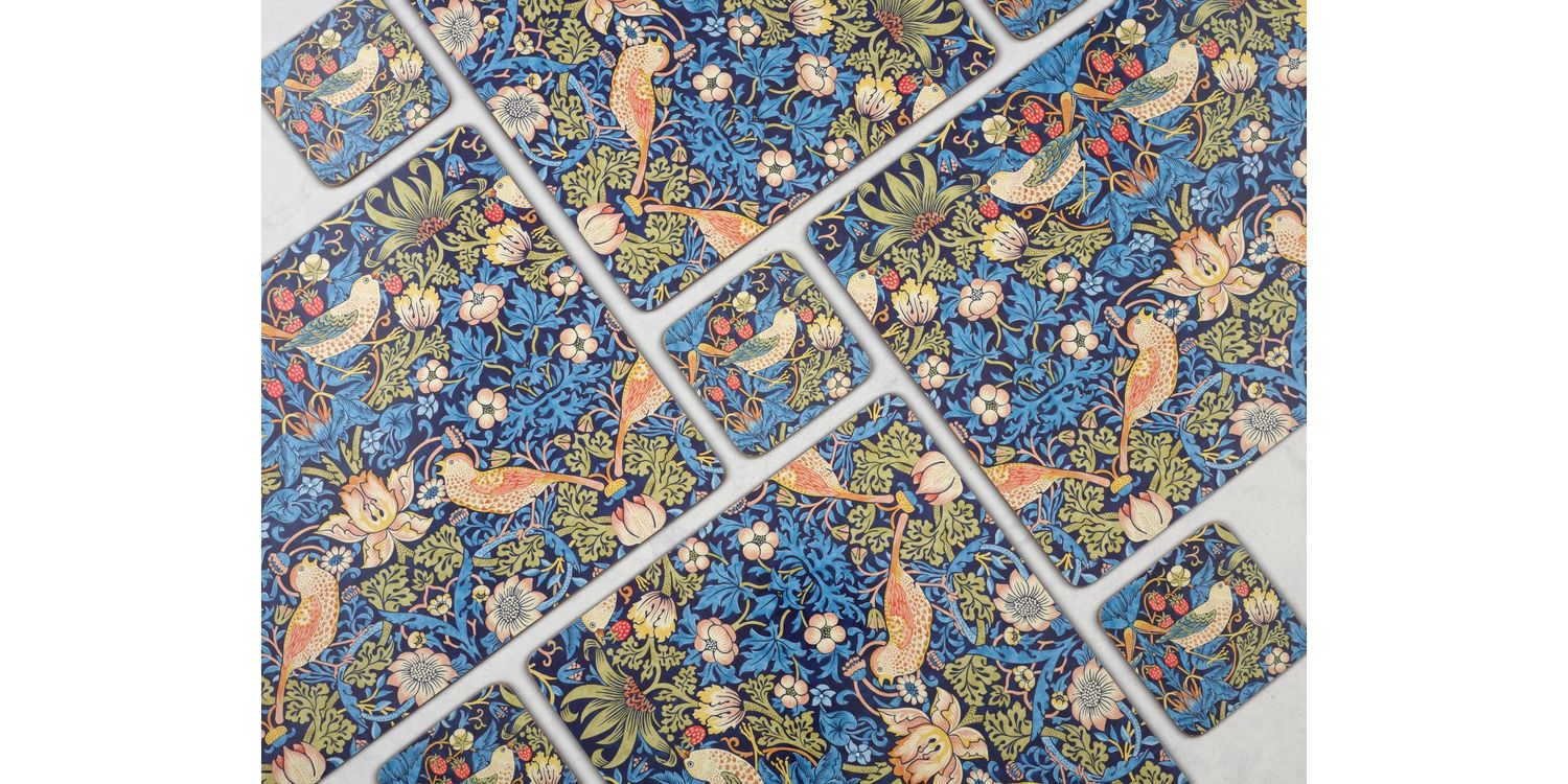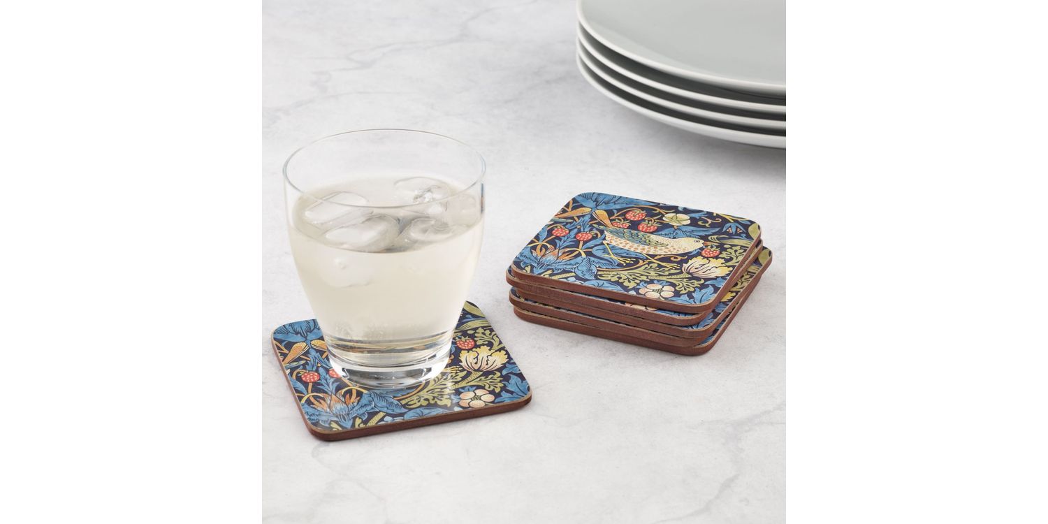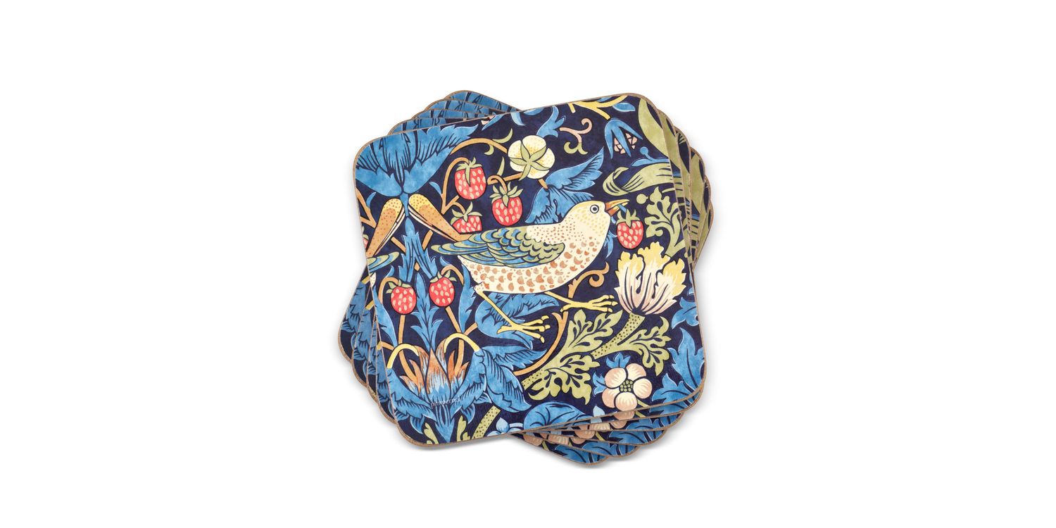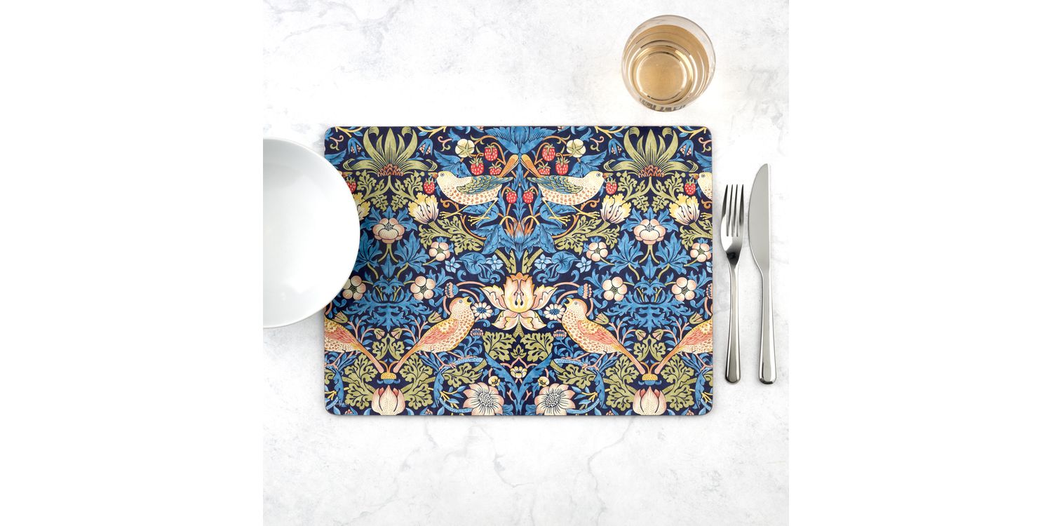Set the perfect table setting with the beautiful Morris & Co. Strawberry Thief design tabemats or coasters. Made to protect your precious furniture and sealed with a coating that is both stain and heat resistent up to 100C. Wonderfully versatile pair these placemats and coasters for a statement table setting.