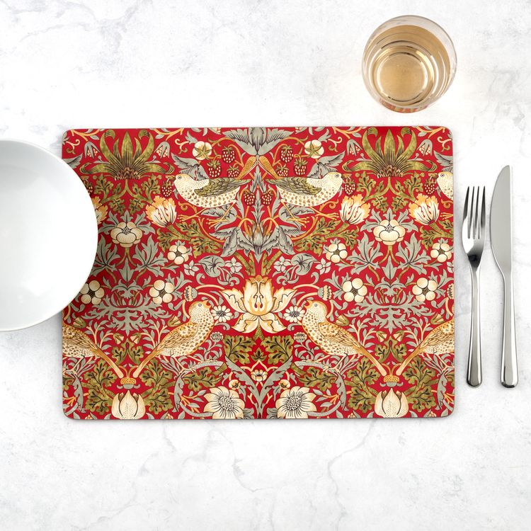 Set the perfect table setting with the beautiful Morris & Co. Strawberry Thief design tabemats or coasters. Made to protect your precious furniture and sealed with a coating that is both stain and heat resistent up to 100C. Wonderfully versatile pair these placemats and coasters for a statement table setting.