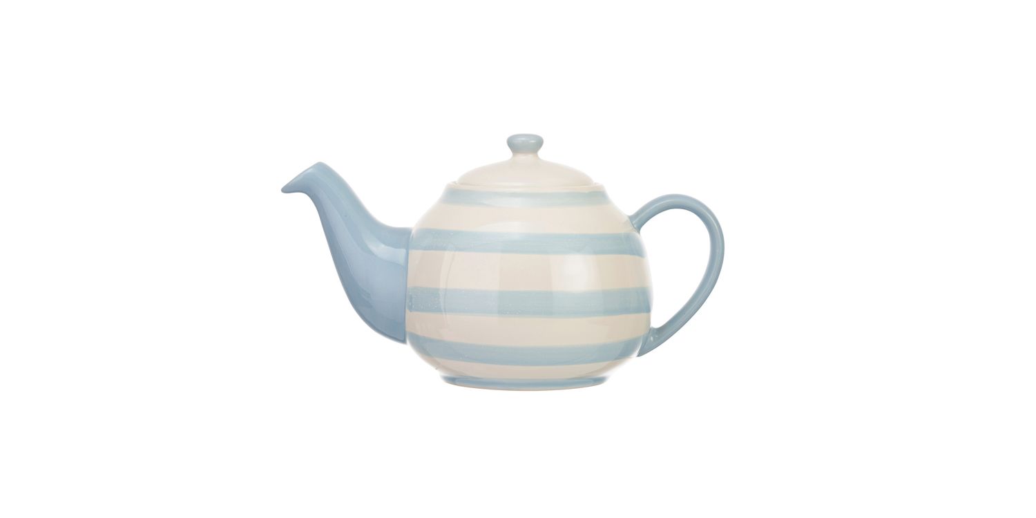 A generously sized teapot with a blue stripe design, perfect for tea with family and friends.
