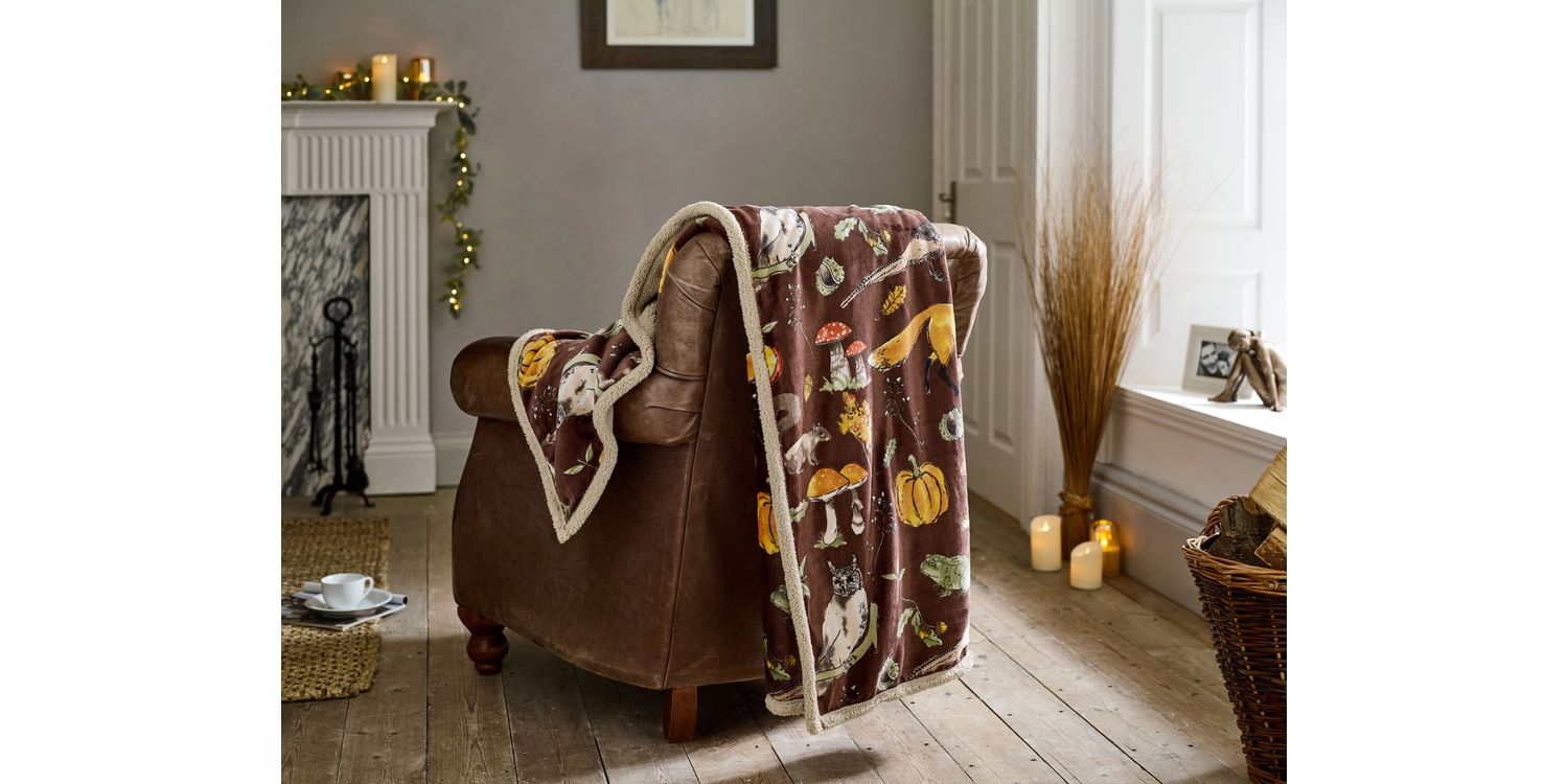 Add charm and warmth with the Autumn Animals Sherpa Fleece Throw. Super-soft, cosy, and machine washable – perfect for sofa or bed with a woodland design.