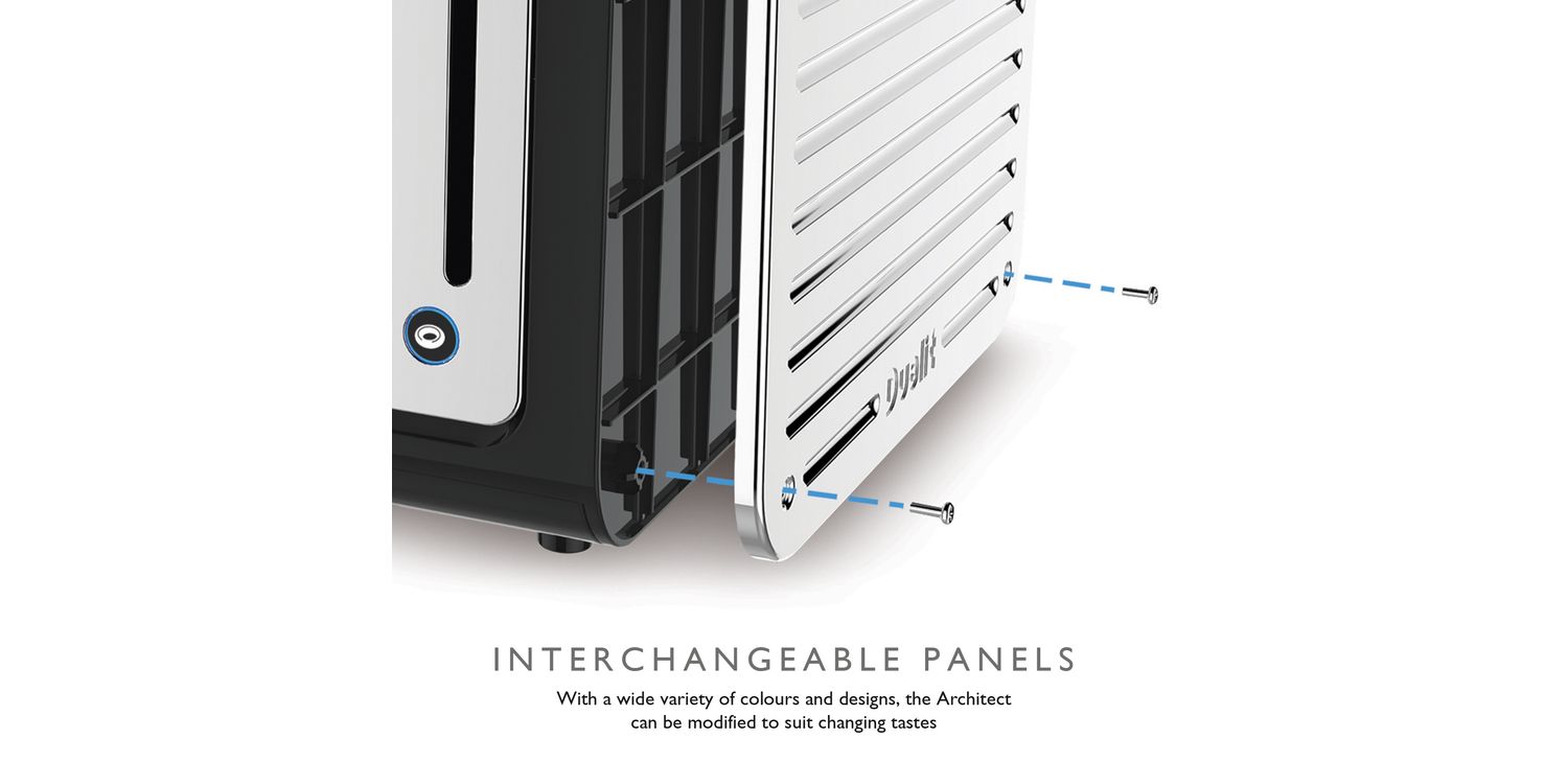 Equipped with Dualit's patented Perfect Toast Technology, it automatically calculates the optimal toasting time based on ambient conditions, ensuring consistently golden results. The interchangeable panel system also allows you to update the toaster's look to suit your style. With reliable performance and a changeable aesthetic, the Dualit Architect Toaster is built to adapt both in style and function, to modern kitchen life.