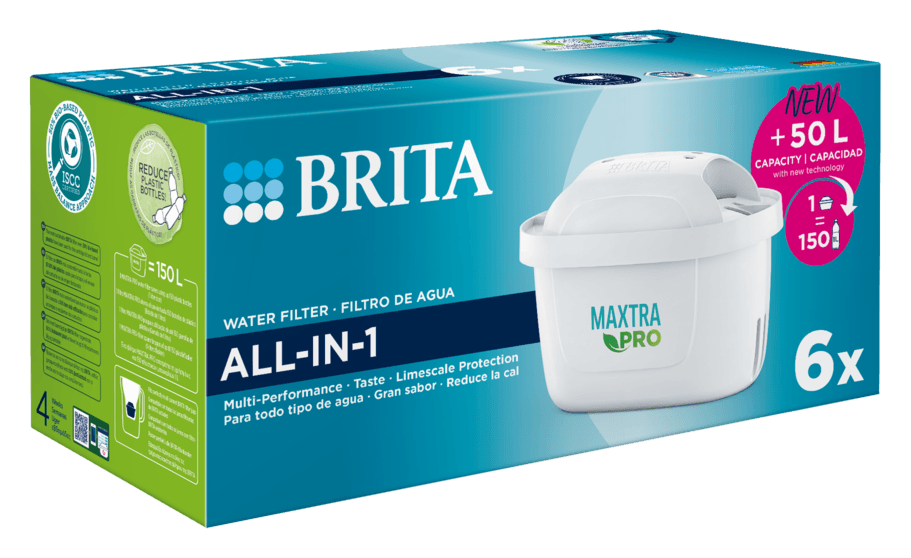 Provides delicious, freshly filtered water, this half-year package: includes 6 Maxtra Pro ALL-IN-1 water filter cartridges. 1 cartridge filters up to 150 litres of water every 4 weeks.